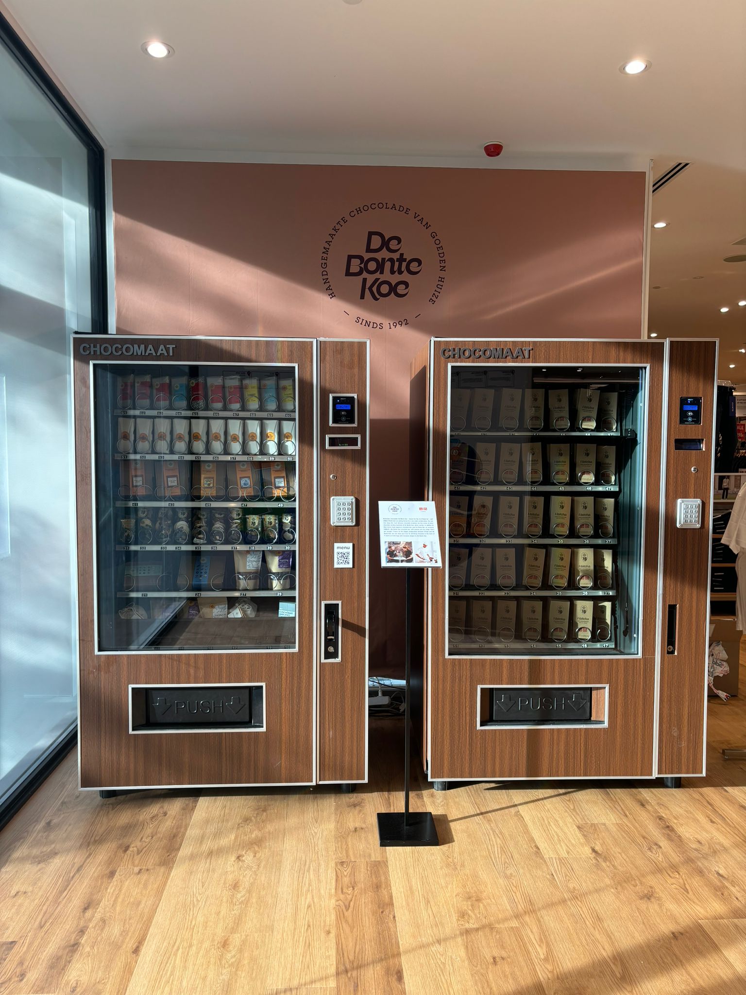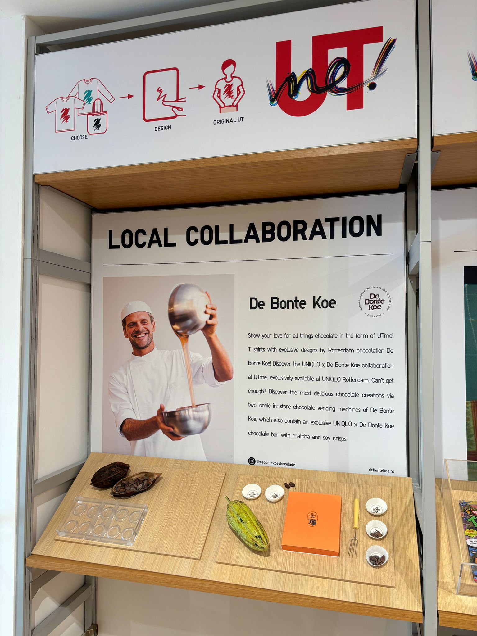 Connor Klein: “Er zijn in de UNIQLO-winkel vitrines met informatie over de lokale samenwerkingspartners. Daarin liggen met betrekking tot ons objecten die met het ambachtelijke maakproces van chocoladeproducten te maken hebben en er is tekst te lezen waarin ik iets vertel over de samenwerking. Daarin leg ik ook uit hoe je in de UNIQLO-winkel een UTme! T-shirt met opdruk van door mij geschetste ontwerpen kunt laten maken. Hoe bijzonder is dat, als wij binnenkort op straat mensen met een De Bonte Koe T-shirt zien lopen.”